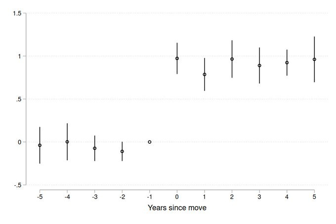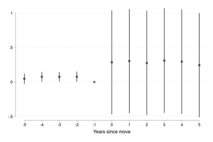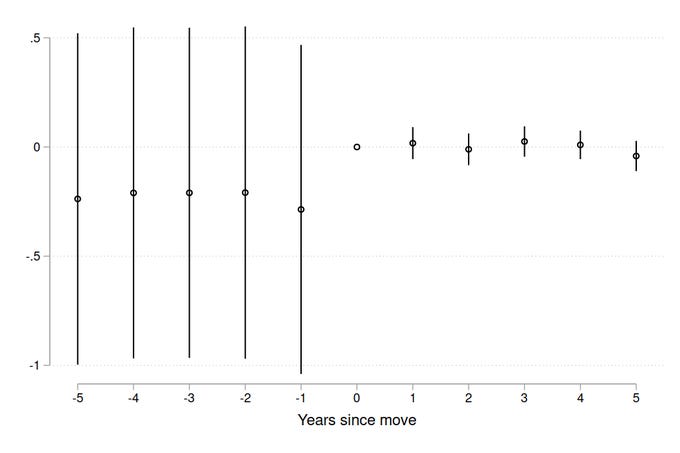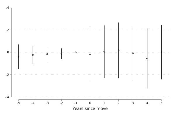 Note that the jump in confidence interval width is just a function of the omitted period. When I omit t=0 instead of t=-1, then the pre-move indicators are nearly collinear with the city fixed effect, and the confidence intervals are now wider pre-move.