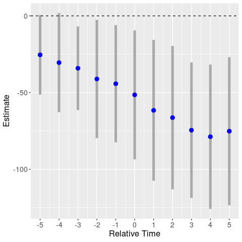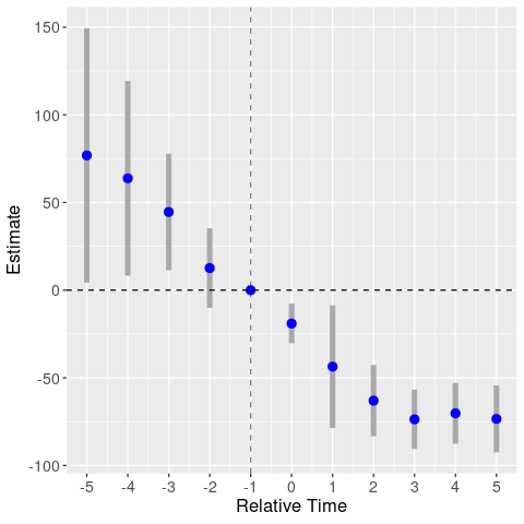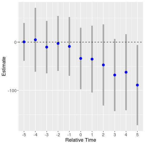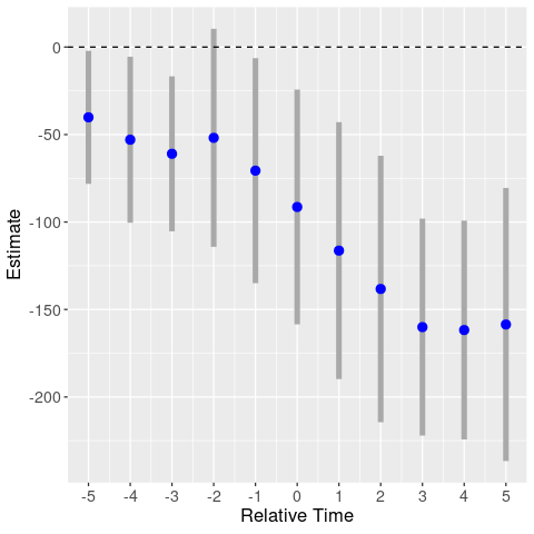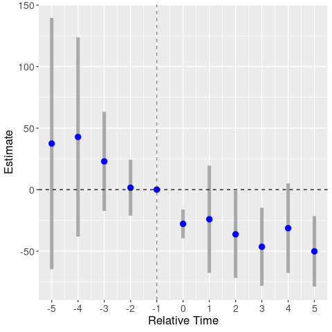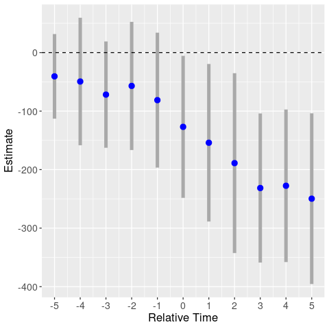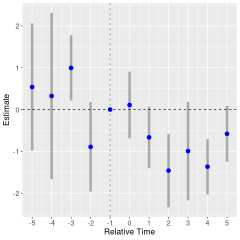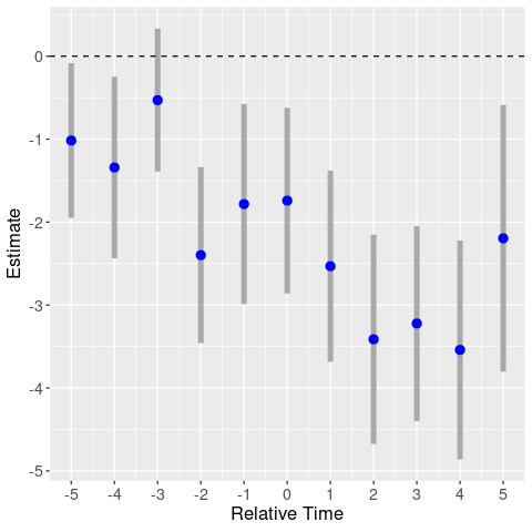 I’m not a fan of binning in event studies. In Andrew Baker’s simulations, binning periods 5- and 5+ performs badly. In contrast, a fully-saturated model including all relative year dummies (except for relative year -1, which is the omitted year) performs perfectly. So let’s try that here.