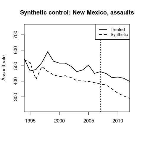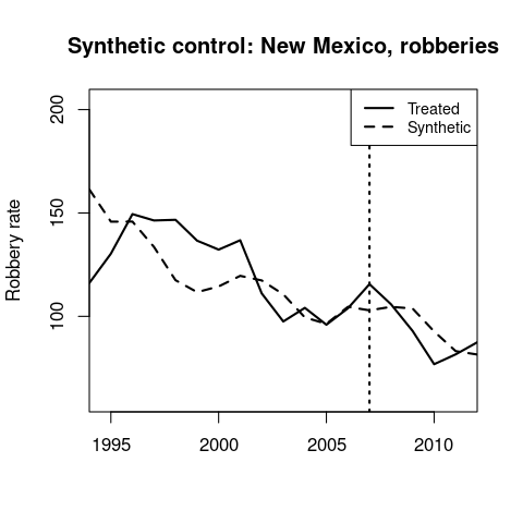 New Mexico’s synthetic control is 51% Mississippi, 21% Louisiana, 18% Texas, and 7% Wyoming. Its MML occurs before a drop in robberies that is partly matched by the synthetic control group.