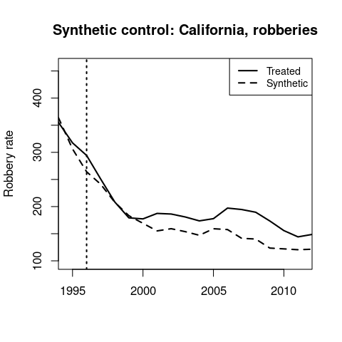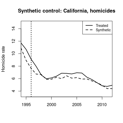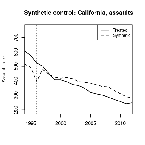 California’s synthetic control is 68% New York and 28% Minnesota. California’s MML occurs in the middle of the 1990s crime decrease, and it doesn’t look like there’s much of an effect in 1996.