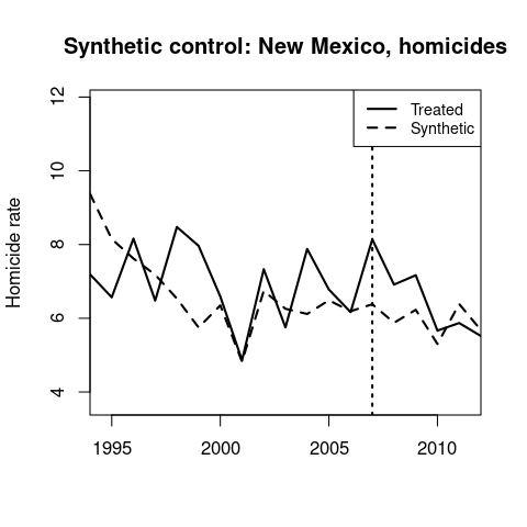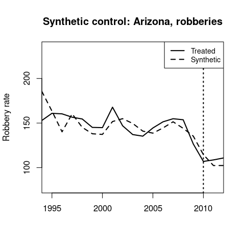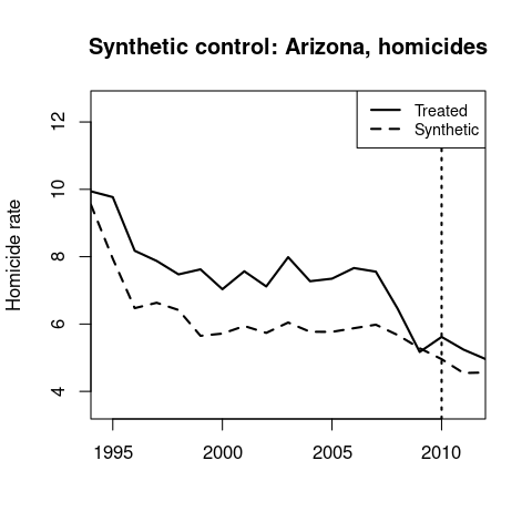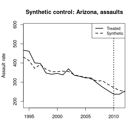 Arizona’s synthetic control is 61% Texas, 24% Florida, and 15% Wyoming. Again, there doesn’t seem to be a treatment effect.