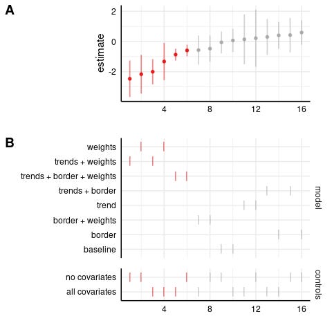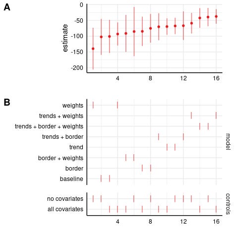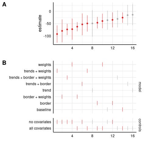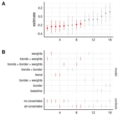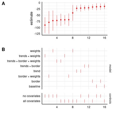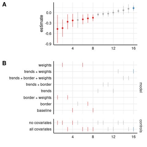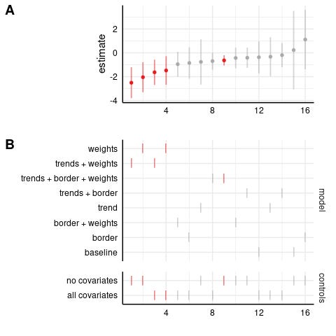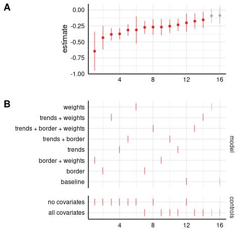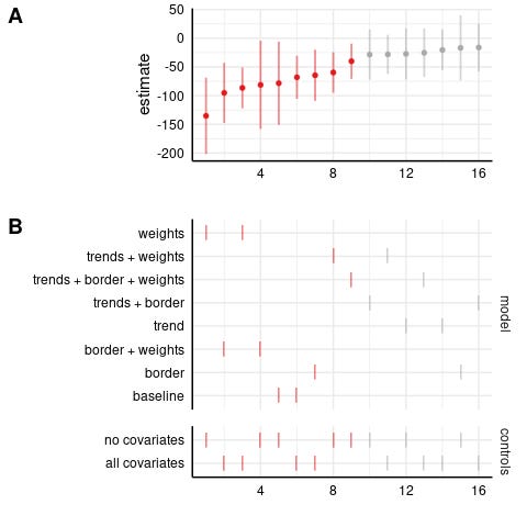 Here are the homicide results, first in the level-level model (as in the paper). Panel A plots the coefficient estimates in increasing order, while panel B shows the corresponding specification. Each specification has two markers in panel B, one in the upper part indicating the model, and one in the lower part indicating whether all or no covariates are included in the model.1 For example, the specification with the most negative estimate is ‘trends + weights, no covariates’. In both panels, the x-axis is just counting the number of specifications, and the color scheme is: (red, negative and significant), (grey, insignificant), (blue, positive and significant). The ‘baseline’ specification omits the state-specific trends, border-year fixed effects, and doesn’t weight by population. I’ll be focusing on the full specification, ‘trends + border + weights, all covariates’, which includes state-specific linear trends, border-year fixed effects, and weights by population.
