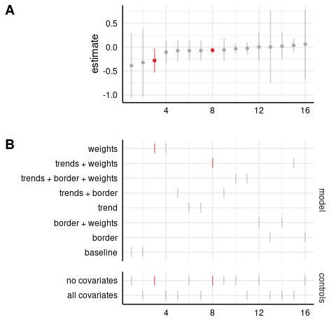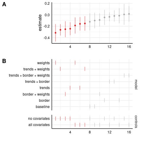 We can see that the estimate is negative and statistically significant in the full specification, with and without covariates. Most estimates are nonsignificant; these are generally the unweighted models, indicating the importance of population weighting for these results.