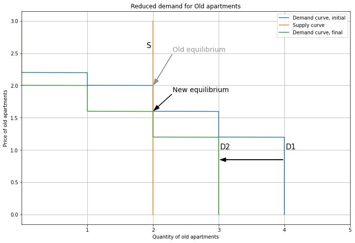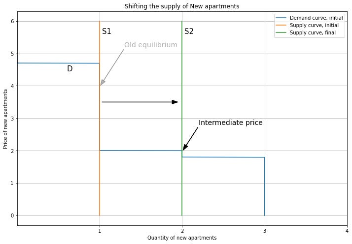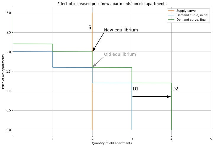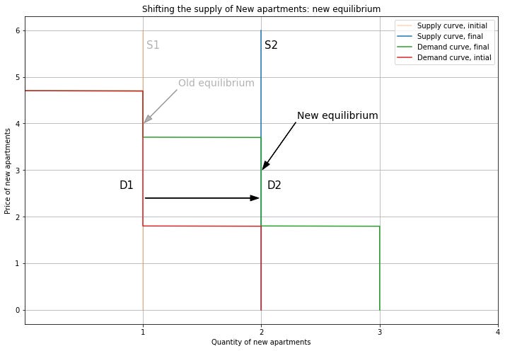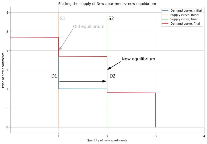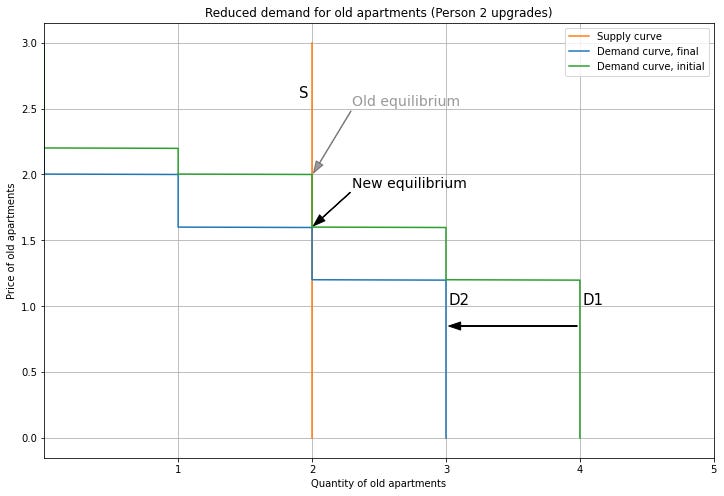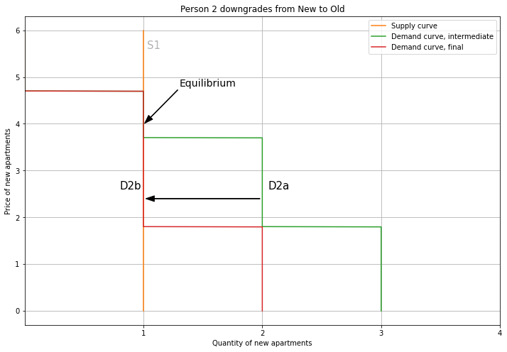 Person 2 upgrading means that we also change which market their demand contributes to. So we subtract their demand from the Old demand curve, and add it to the New demand curve, shifting it to the right. For New apartments, this pushes up the price. Note that we can end up out of equilibrium if this increase in price is not consistent with Person 2’s willingness to pay. Here, I’ll use the modelling flexibility we have from the supply and demand curve overlapping to choose a new equilibrium price of 3.