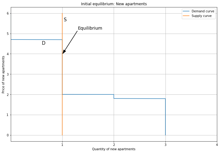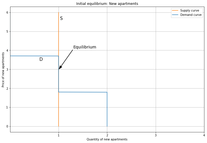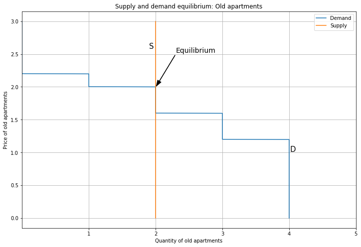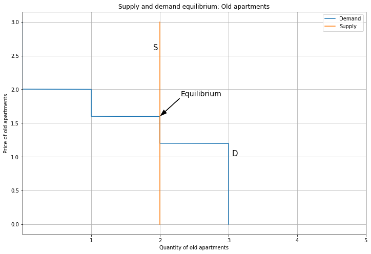 Since each person demands one unit, aggregate demand tops out at four. Next, here’s the supply and demand equilibrium for Old apartments. The supply curve is vertical, representing a fixed stock of Old apartments. Since the supply curve overlaps the demand curve for some segment, technically the equilibrium is not well-defined. However, this is not a big deal, because we can pretend the supply curve is slightly sloping upward, so the intersection is unique (though this brings in continuous quantities). Alternatively, if we had a large number of consumers, the demand curve would be a straight line that intersects supply uniquely; working with discrete quantities is just a pain.