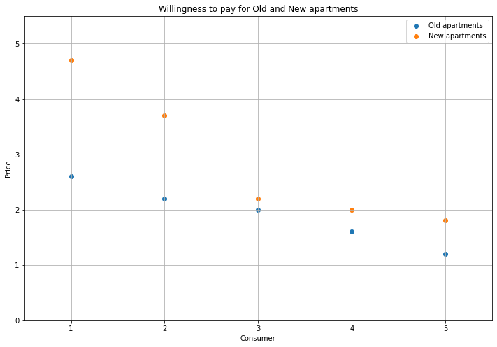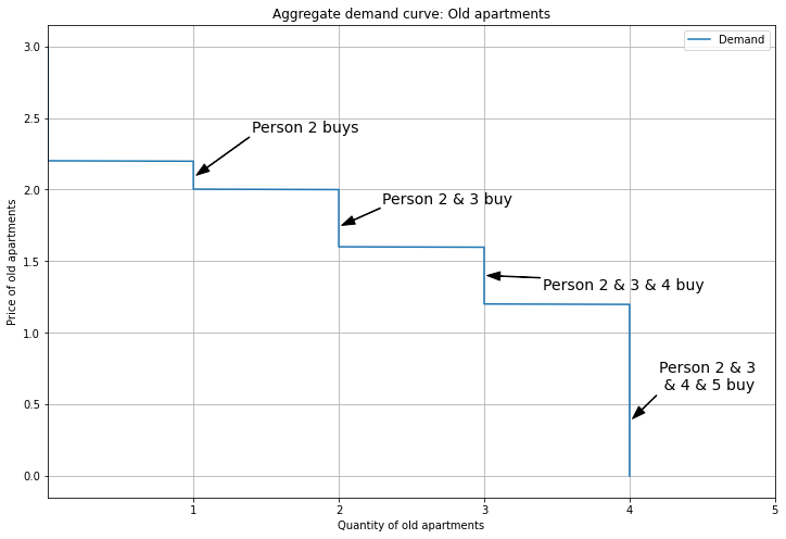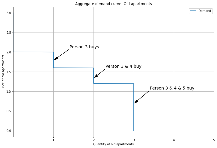 I’ll show an initial equilibrium where Person 1 buys a New apartment, and Persons 2 and 3 buy Old. Because Person 1 buys New, their demand is removed from the Old market. Hence, the aggregate demand curve for Old apartments looks like this:
