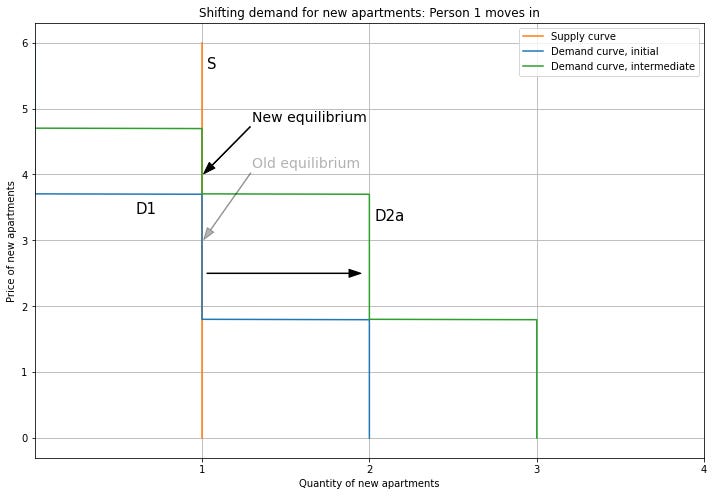 The demand cascade starts with Person 1 moving in and bidding for a New apartment. This shifts the demand curve to the right (from D1 to D2a), increasing the price from 3 to 4.