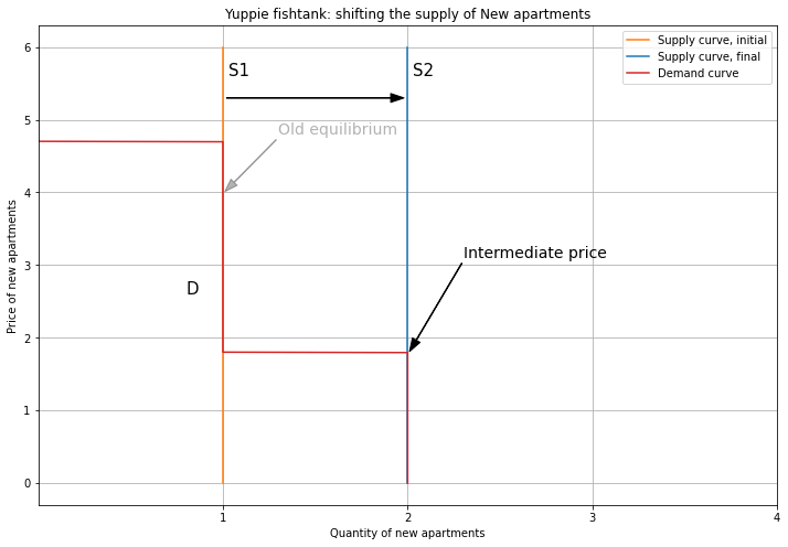 This lower price induces Person 2 to upgrade back to a New apartment. So the demand curve shifts right, and the price is 3. This is the same as the initial equilibrium: the yuppie fishtank has absorbed Person 1’s demand, keeping prices flat.