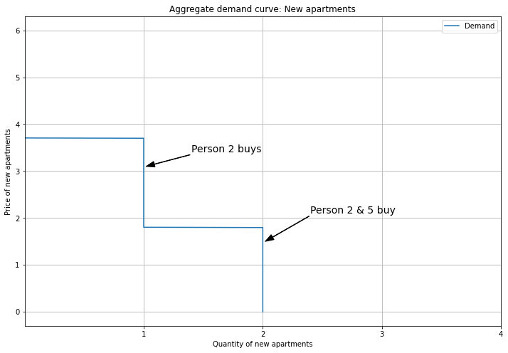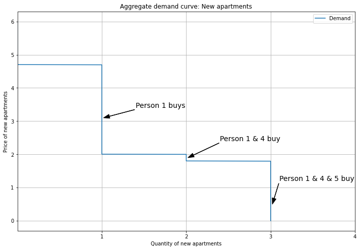 Next we have the aggregate demand curve for New apartments. Here we show Persons 1, 4, and 5, because Persons 2 and 3 buy Old apartments, so their demand for New is removed (by the unit demand constraint).